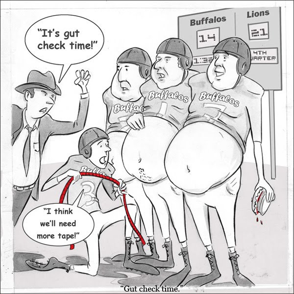 You see, when I hear the words gut check time, instead of conjuring up visions of pending victory, my mind quickly wanders to ghastly glimpses of extra-beefy NFL offensive linemen with bulging bellies bombarding my brain and bringing a whole new meaning to this time-honored cliche.